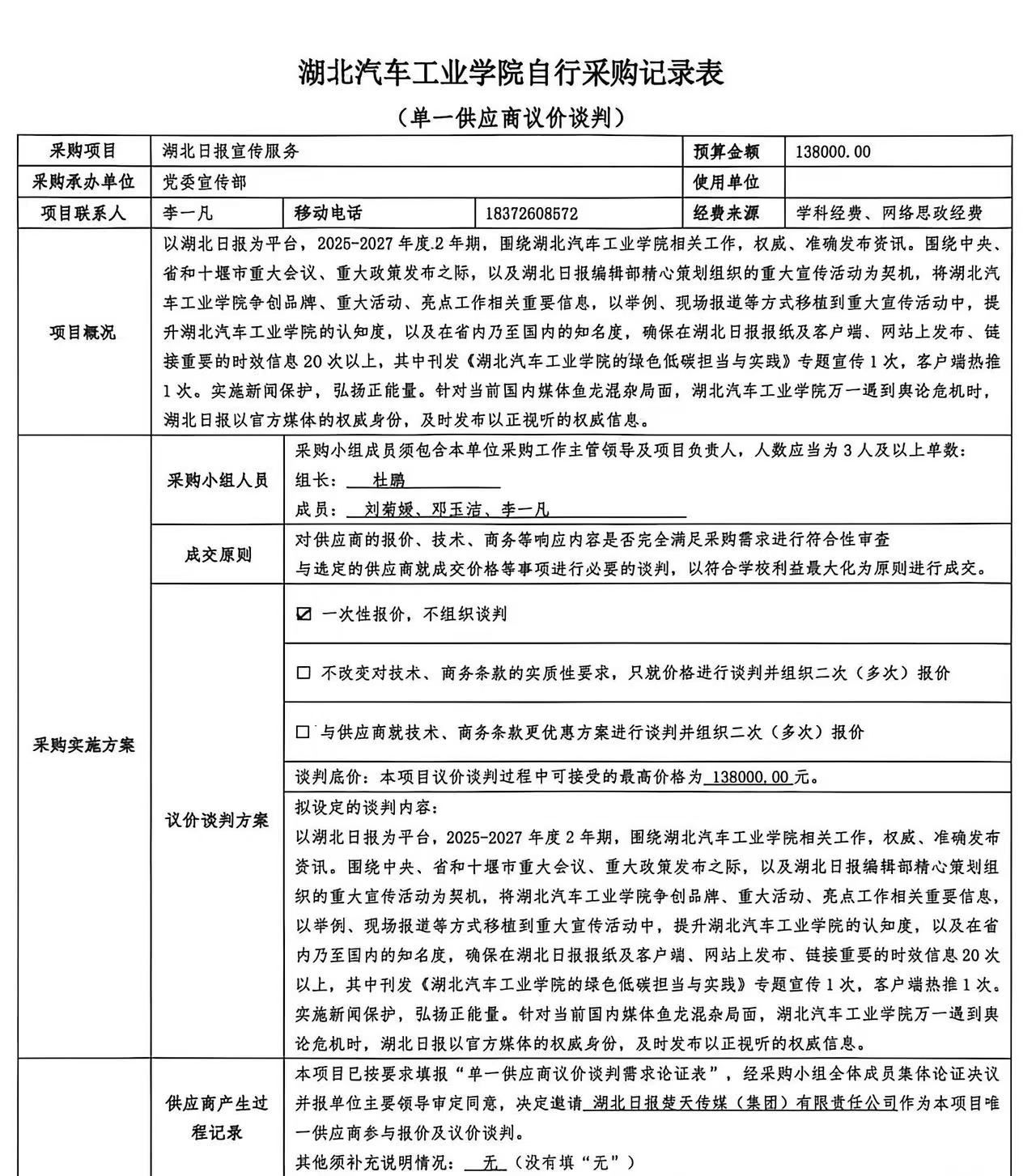 湖北汽车工业学院2025湖北日报宣传服务自行采购记录公示